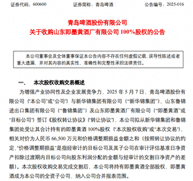 【人人网耗尽概括报谈】5月8日,青岛啤酒(600600)发布公告称,拟以东谈主民币6.65亿元及价钱调遣期损益金额之和,再行华锦集团和鲁锦集团处受让其有计划握有的山东即墨黄酒厂有限公司(简称“即墨黄酒”)100%股权。本次来回完成后,即墨黄酒将成为青岛啤酒的全资子公司,纳入公司归并报表界限。