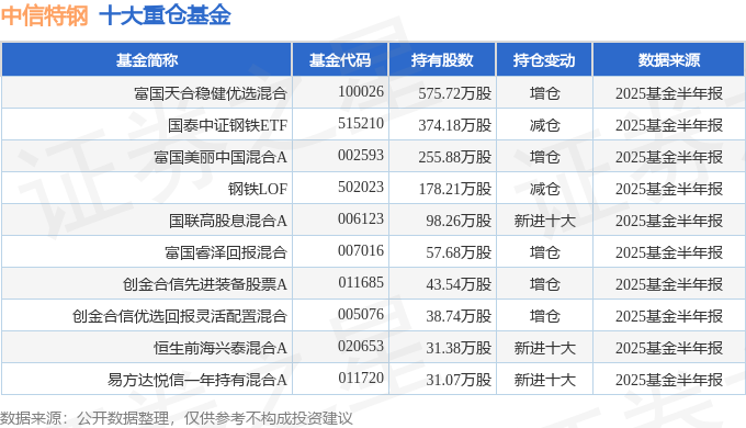 捏有中信特钢最多的基金为富国天合镇定优选夹杂,当今限度为22.81亿元,最新净值1.5576(8月20日),较上一来往常高潮0.41%,近一年高潮25.23%。该基金现任基金司理为张啸伟。