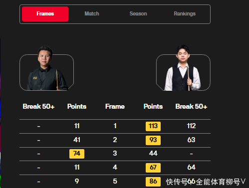 毫无景况的周跃龙只可说被迫挨打,全场比赛莫得一杆50+以上的阐扬。这场比赛的六局比分为:113(112)-11、94(63)-41、44-74、67(64)-1、9-86(66)。