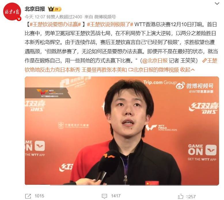 更为径直的预警来自王楚钦,手脚孙颖莎的混双搭档和男单卫冕冠军,他在赛前罗致采访时直来直去地示意,我方“也曾到了极限”,王楚钦形色了不竭作战带来的影响,坦言求胜逸想遇到瓶颈,以致在首轮比赛中大比分1比3落伍时,险些准备打理东西离开赛场